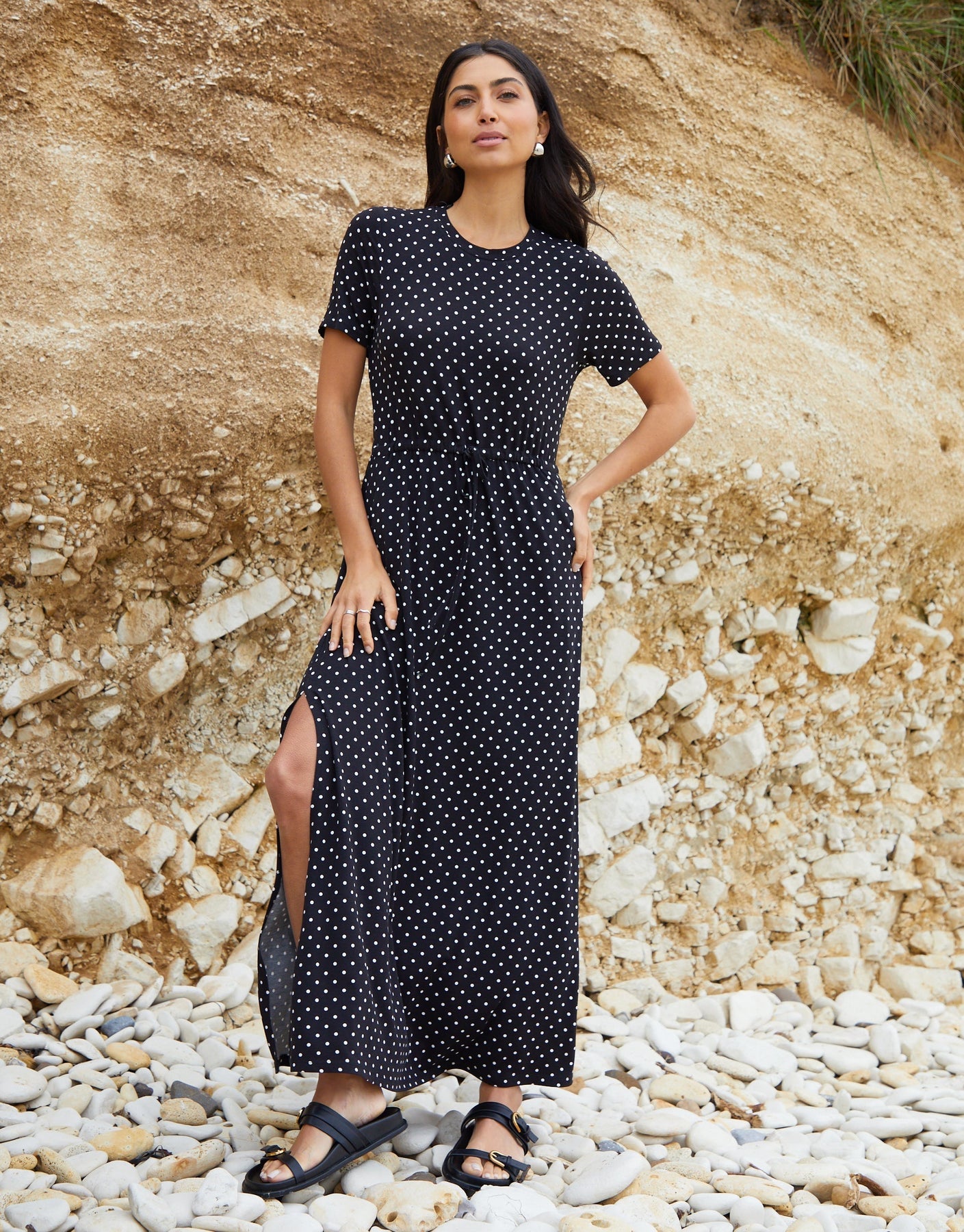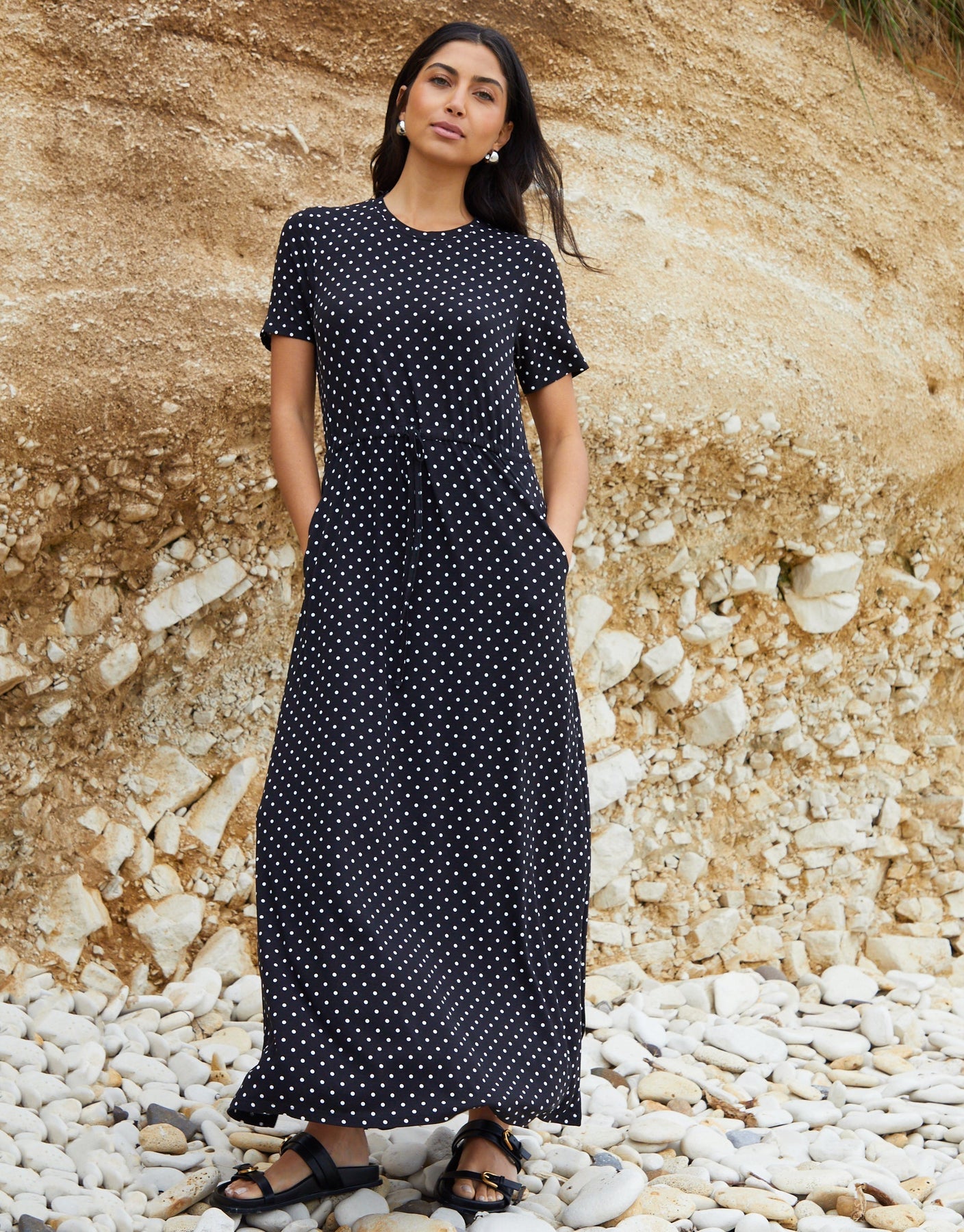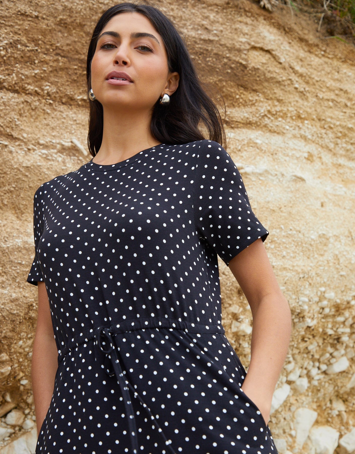 Women's Black Polka Dot Ruched Waist Jersey Midi Dress with Pockets