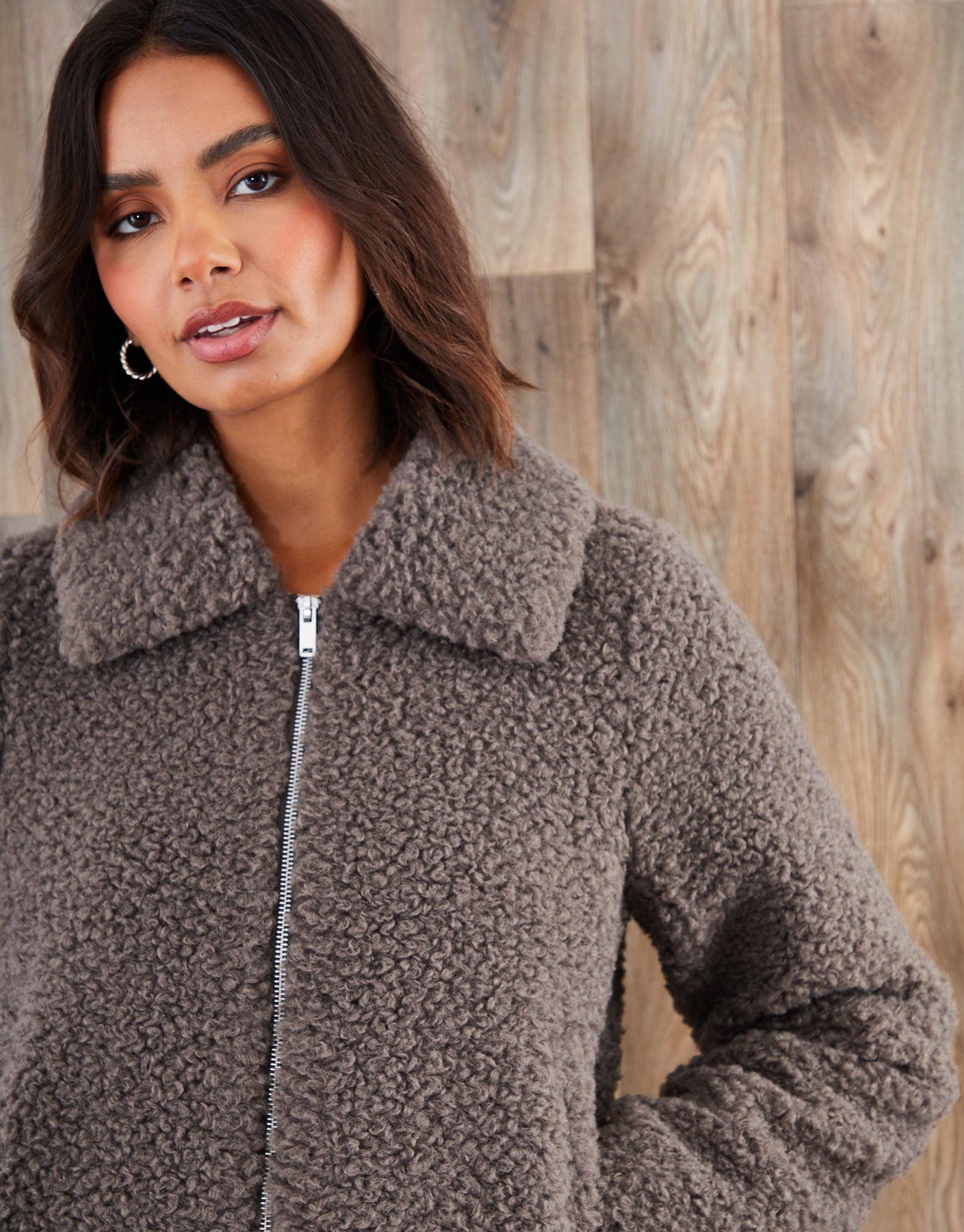As the weather drops add some statement style to your wardrobe with this bomber-style borg toggle jacket.