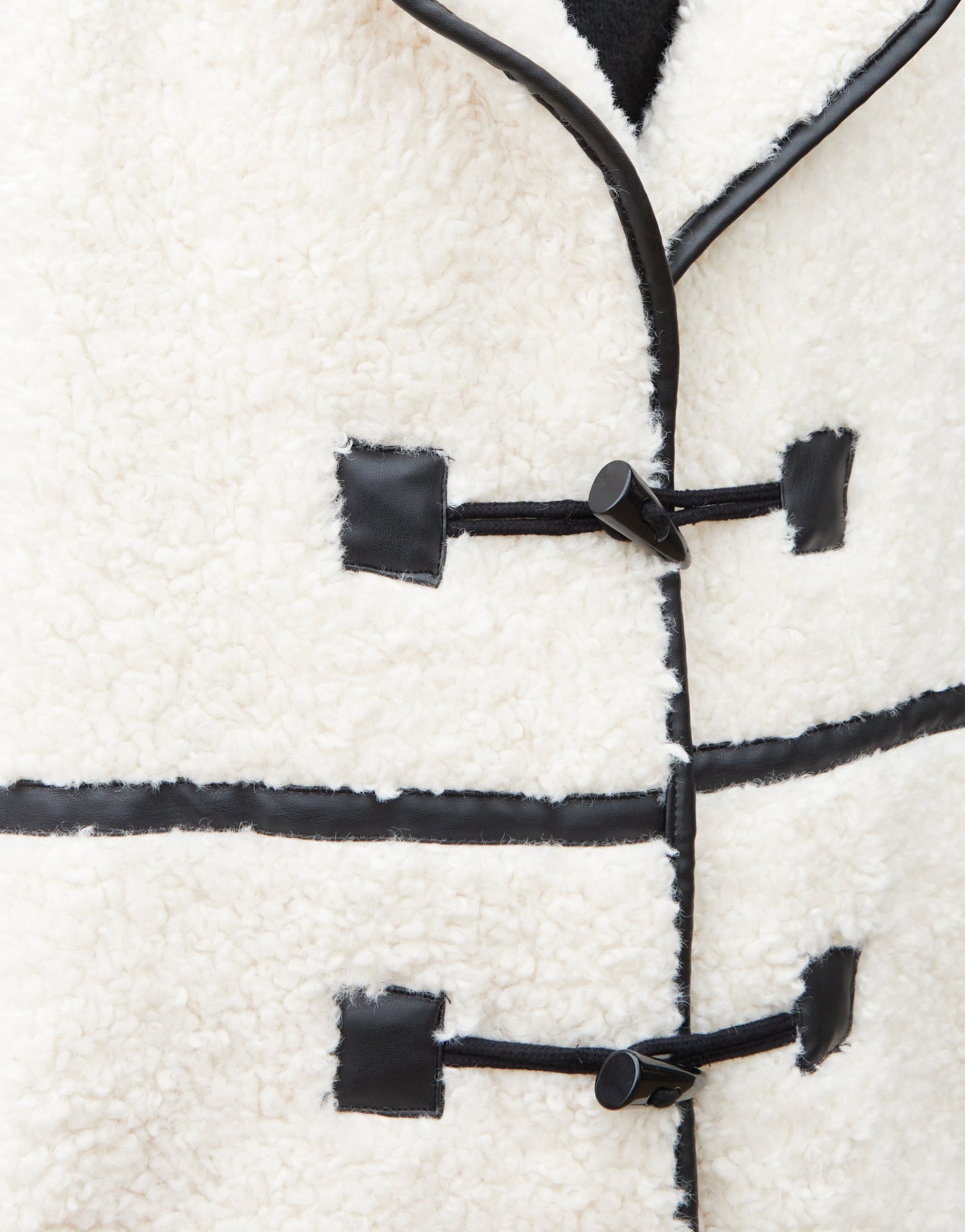In a borg fabric that’s soft to the touch, the fuzzy look is perfect for autumn and winter. In a longline length and with a large revere collar, this coat is single-breasted with PU toggle fastening, while the cuffs, hem and collar have contrast PU trims. Our borg jacket is fully lined and has two side pockets, perfect for keeping your hands warm in winter.